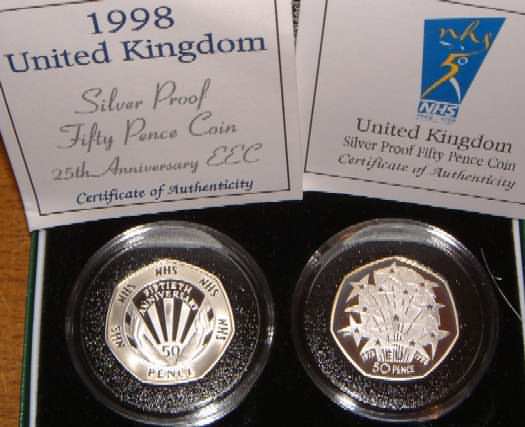 | 1998 silver | Pair NHS (National Health Service) 50th Anniversary & 25th Anniversary of Britain's entry into the EEC (European Economic Community) & Presidency of the EU (European Union). In Royal Mint Box & COA |